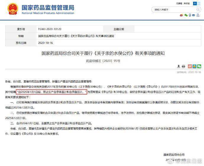 北京日报12月9日报谈,左证此前国度药监局发布的奉告,自2026年1月1日起,我国将全面扼制坐褥含汞体温计和含汞血压计居品,这一策略符号着水银体温计行将认真退出历史舞台。左证原环境保护部会同关系部委2017年发布的第38号公告(以下简称38号公告),《对于汞的水俣左券》(以下简称《汞左券》)自2017年8月16日起对我国告成,其中明确“自2026年1月1日起,扼制坐褥含汞体温计和含汞血压计。”为贯彻落实《汞左券》和38号公告,作念好含汞体温计和含汞血压计居品的注册和坐褥关联职责,现就关联条目奉告如下:一、 也曾得到医疗器械注册证的含汞体温计和含汞血压计居品,原注册证在文凭有用期内不时有用;注册证有用期届满不错请求延续注册,但为止其注册证有用期不得跳跃2025年12月31日。二、 也曾按照医疗器械受理的含汞体温计和含汞血压计居品,不时按照医疗器械进行审评审批,准予注册的,发给医疗器械注册证,为止其注册文凭有用期不得跳跃2025年12月31日。三、 自2026年1月1日起,全面扼制坐褥含汞体温计和含汞血压计居品。